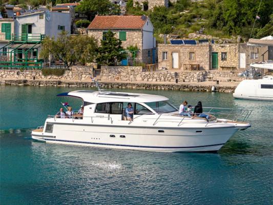 The boat has many similarities to her smaller sisters but offers several new features. The Nimbus Design Team has added several interesting aesthetic and functionally integrated details. These include twin touch screens at the helm, room for five to ride facing forward, a new D-pillar with integrated ventilation, fully glazed aft deck door, electric powered table on the aft deck and a “granny hatch” that conceals a main power plug on the stern. Other innovations include newly designed engine room ventilation in the hull sides with powered extractors, galley with ceramic gas hob and dark composite worktop, 120-liter capacity fridge plus extra cool storage in pull-out drawers beneath the salon sofa and much more.